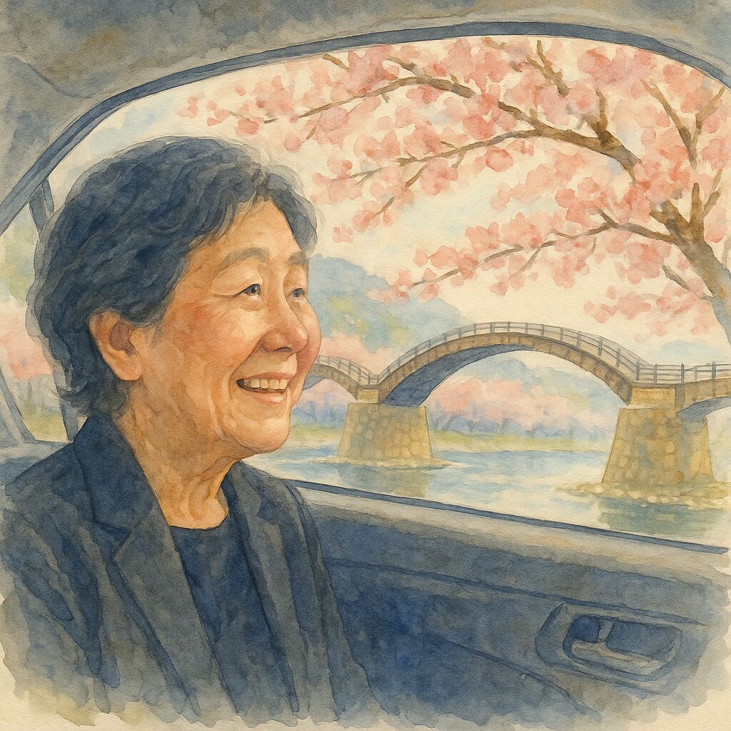 車窓から見える錦帯橋の桜並木を指さしながら、