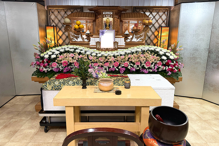 ご遺体をトワ家族葬ホール岩国(1階式場)に搬送し、ご安置・ご納棺・お通夜・ご葬儀(一日葬)を行います。